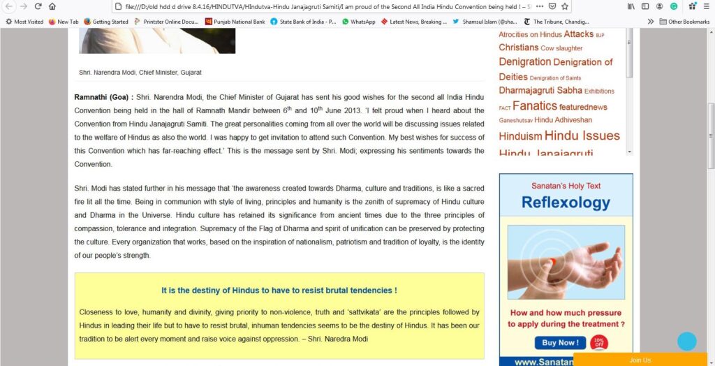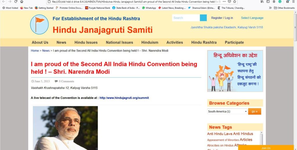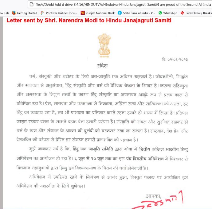 Modi was in Goa in June 2013 for the BJP executive committee meeting. He as Gujarat CM sent a message to the ‘All India Hindu Convention for Establishment of Hindu Nation’ organized by the Hindu Janajagruti Samiti (HJS) at Goa from June 7. Modi’s message lauding the conference for establishing a Hindu nation read: