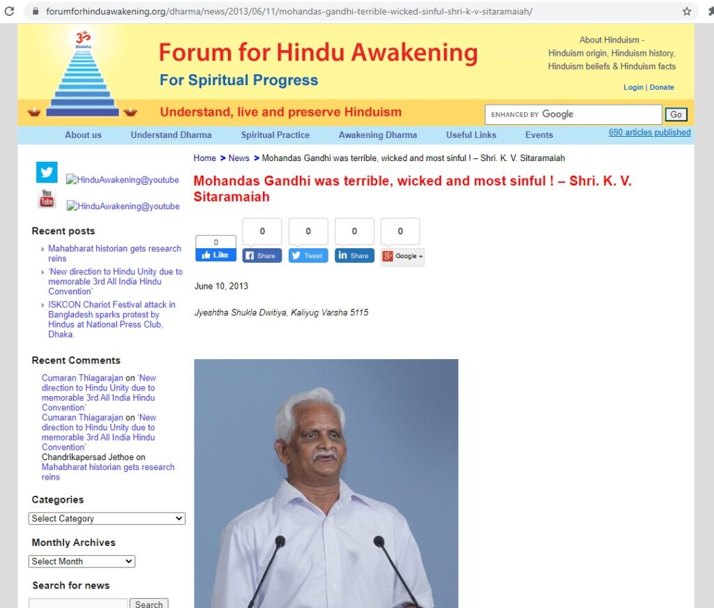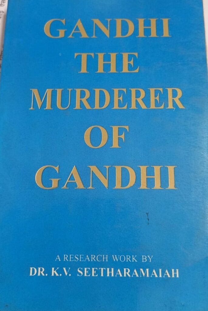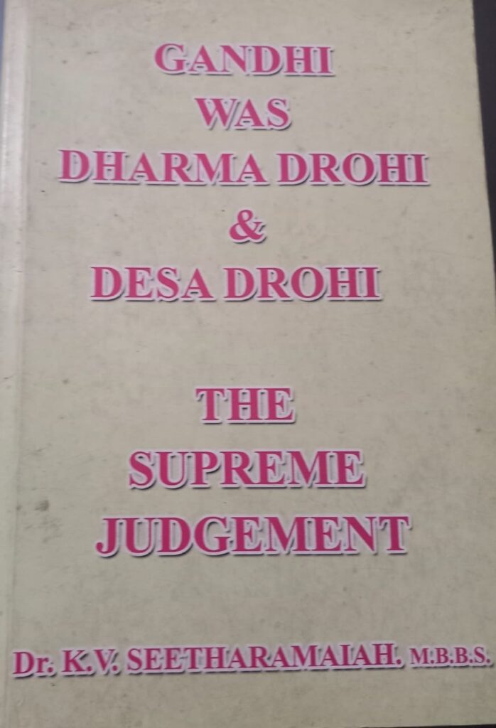 It is to be noted that K.V. Sitaramaiah has also authored two books titled ‘Gandhi was Dharma Drohi [anti-religion] and Desa Drohi [anti-religion]’ and ‘Gandhi was Murderer of Gandhi’ in which the back cover text of the first book, quoting from the epic Mahabharat, demands “Dharma Drohis must be killed“, “Not killing the deserved to be killed is great sin” and “where the members of Parliament seeing clearly allow to kill Dharma & truth as untruth, those members will be called dead“.