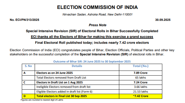 After three months of controversy in Bihar’s Special Intensive Revision, on September 30, the Election Commission of India (ECI) has published the final electoral rolls for Bihar. The Special Intensive Revision (SIR), initiated on June 24, has brought the state’s total registered voters down from 7.89 crore to just under 7.42 crore—a net drop of around 47 lakh names, or nearly 6 percent.