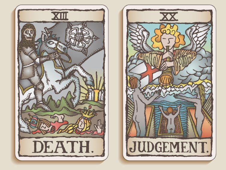 Hand-drawn, grungy, textured Tarot cards depicting the concept of Death and Judgement. Shutterstock