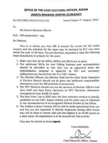 The Times of India reported that, Chief Minister Himanta Biswa Sarma publicly declared that the SIR would “cleanse” the rolls. Assam’s Chief Electoral Officer (CEO) Anurag Goel instructed district officials to complete preparations within twenty days — a pace that mirrors the high-pressure Bihar exercise. The reference point here is the 2005 revision, now being shared with political parties for comparison.