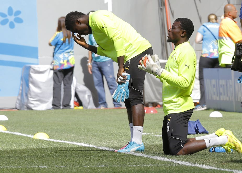 Ghana’s goalkeepers, Stephen Adams (L) and Fatawu Dauda ®, pray before a 2014 World Cup match. Robert Ghement/EPA