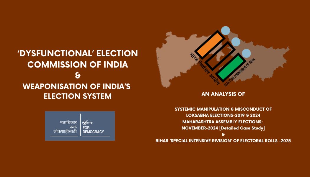 Vote for Democracy (VFD), guided by election experts M.G. Devasahayam, Dr. Pyara Lal Garg, Madhav Deshpande, and Prof. Harish Karnick, has released a constituency-level analysis of Maharashtra’s 288 Assembly seats revealing serious anomalies in the November 2024 elections. The report — “Dysfunctional ECI and Weaponisation of India’s Election System” — uses official Election Commission of India (ECI) and Chief Electoral Officer (CEO) data, plus ground accounts from staff and voters, to raise urgent questions about transparency and accountability. The report was formally released in Bengaluru on Saturday August 16 and may be read here.