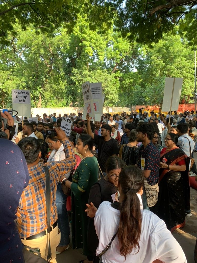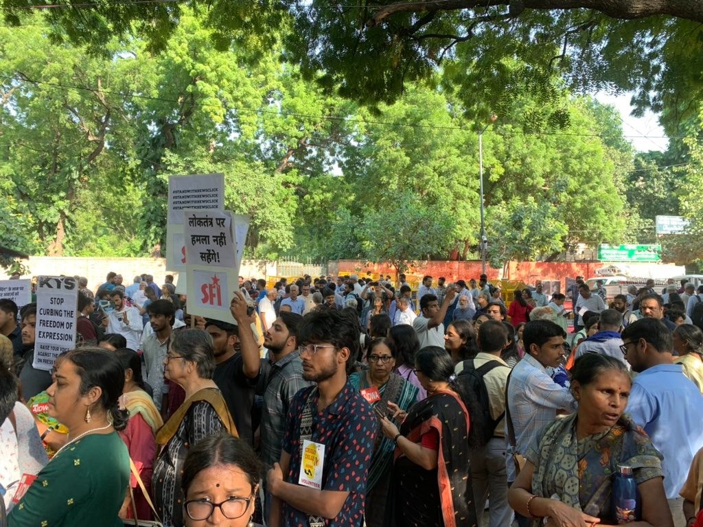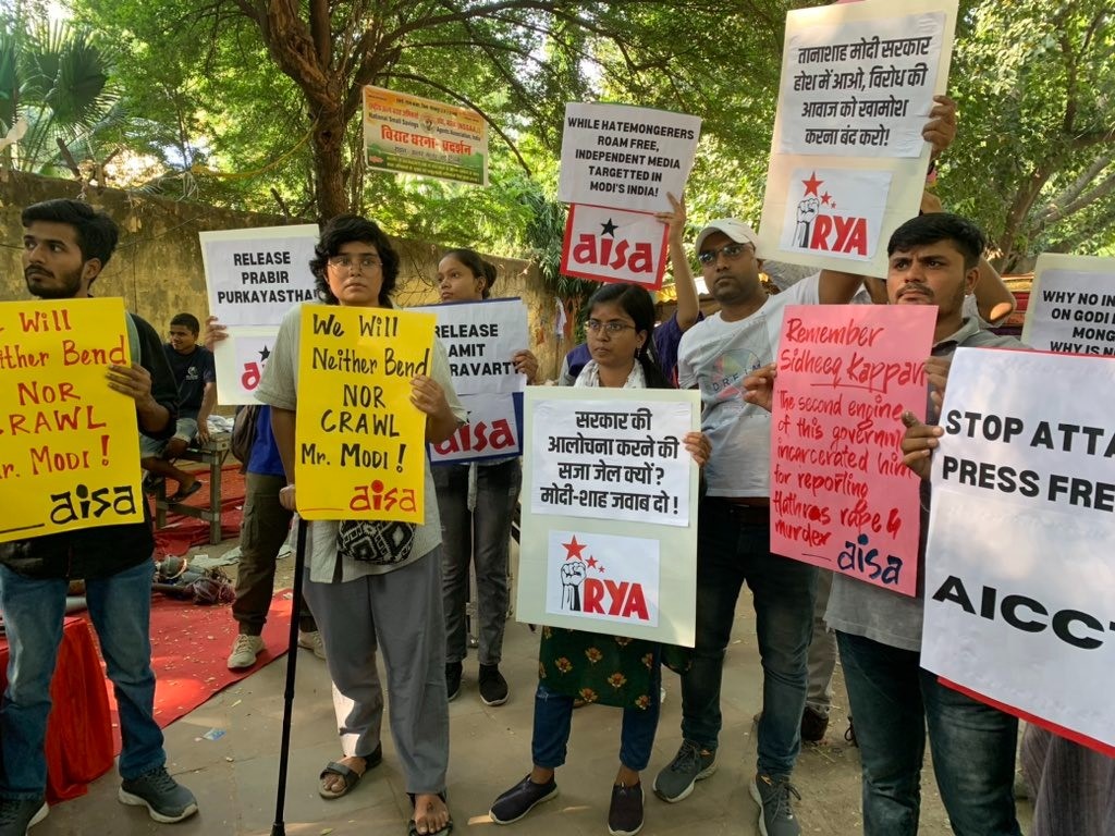 On October 4, a protest was called by All India Students’ Association (AISA) at Delhi’s Jantar Mantar. The said protest saw the participation of a large group of civil society members- journalists, students and citizens. Protestors could be seen carrying banners at the protest, bearing the messages “We will neither bend nor crawl”, “Release Prabir Purkayastha” and “Stop attack on press freedom”. As per reports, the said protest saw the participation of more than 500 people.