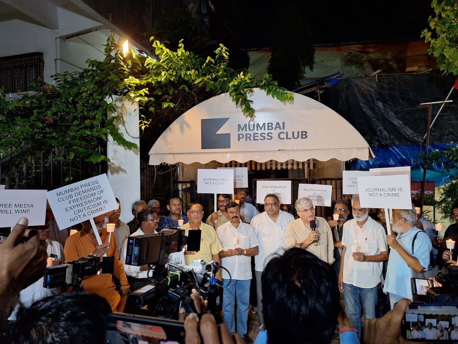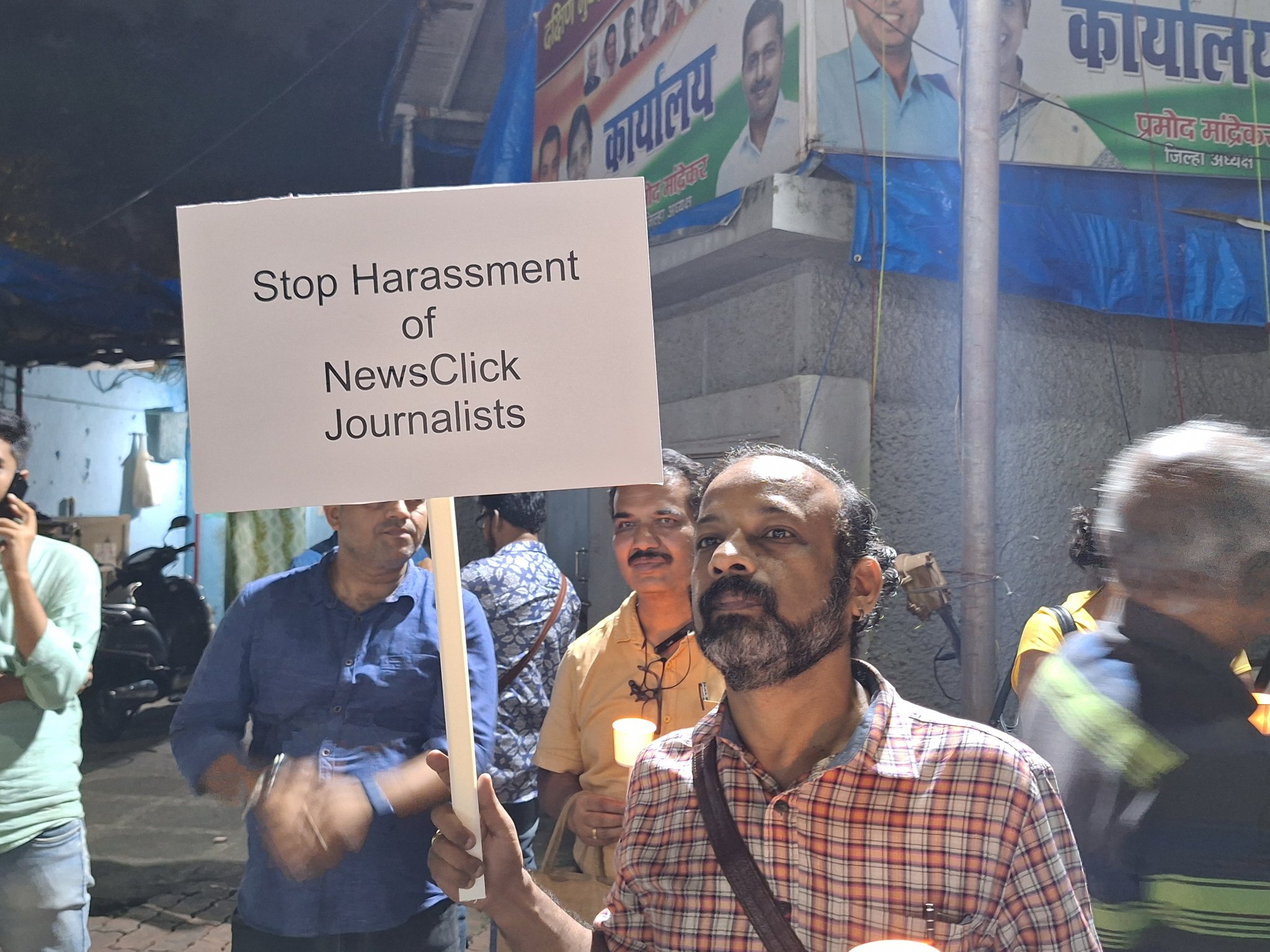 Various media organisations in Mumbai came together to hold a candlelight vigil in solidarity with the NewsClick journalists on October 5 within the premises of the Mumbai Press Club. The event was backed by the Mumbai Press Club, Mumbai Marathi Patrakar Sangh, TV Journalists Association, Brihanmumbai Union of Journalists, Bombay News Photographers Association, and Mantralaya Vidhimandal Vartahar Sangh.