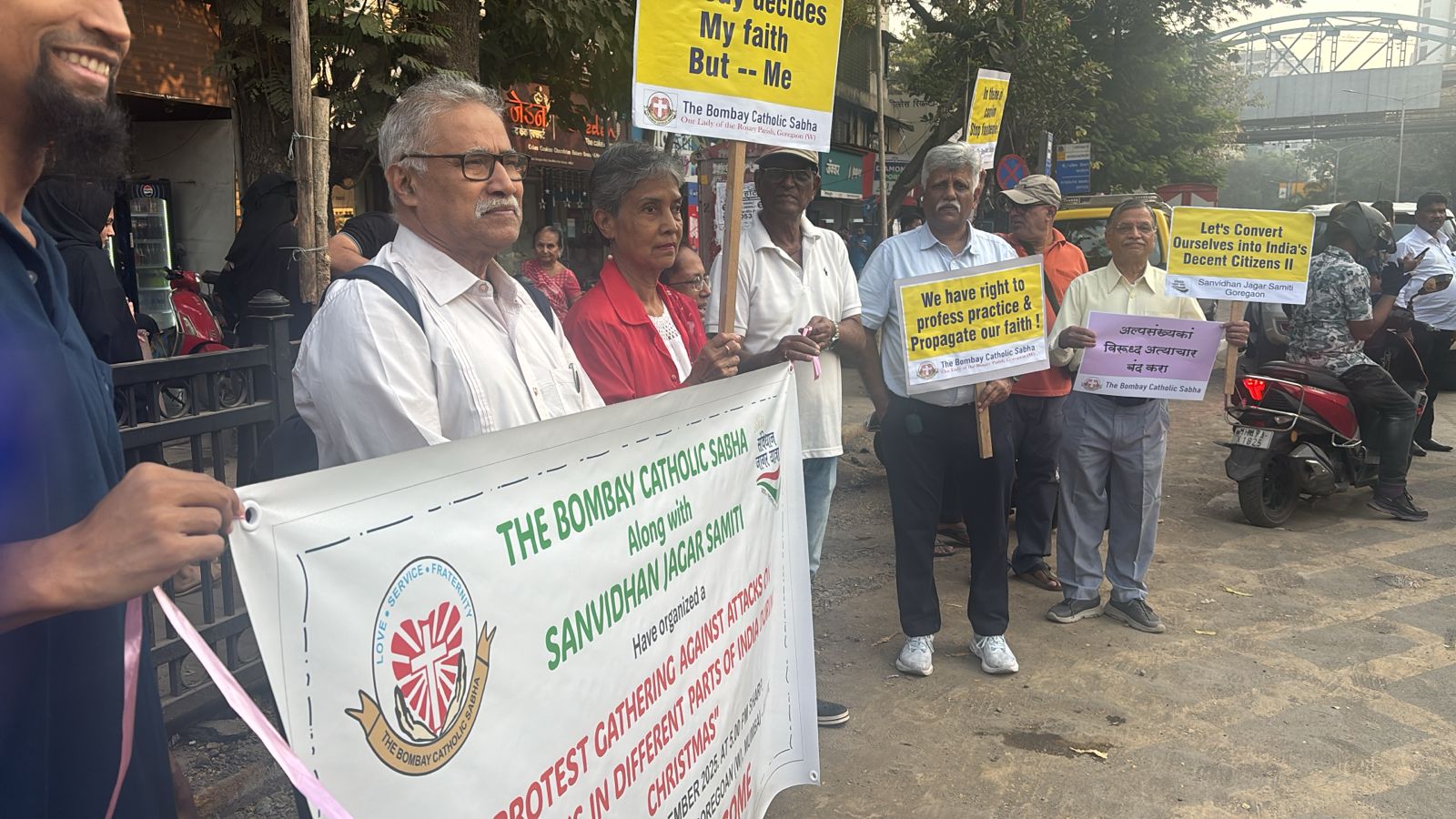 Organised by the Samvidhan Jagar Samiti and the Bombay Catholic Sabha, the peaceful gathering in Goregaon drew quiet public solidarity as passersby paused to read, reflect, and express support against rising hate and intimidation during the Christmas season