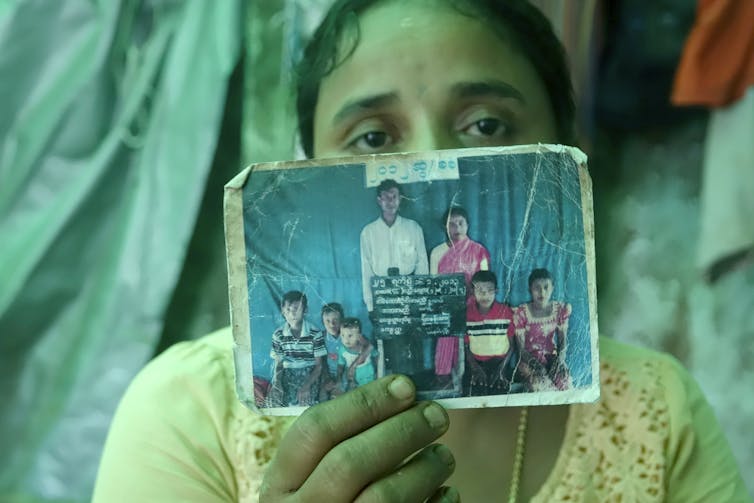 A Rohingya woman living in a refugee camp holds up a picture of her family. EPA/Nyunt Win
