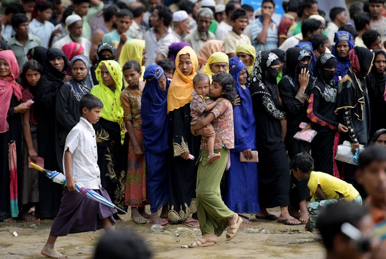 Rohingya women line up to receive aid at the Balukhali food distribution centre near Cox’s Bazar in Bangladesh. EPA