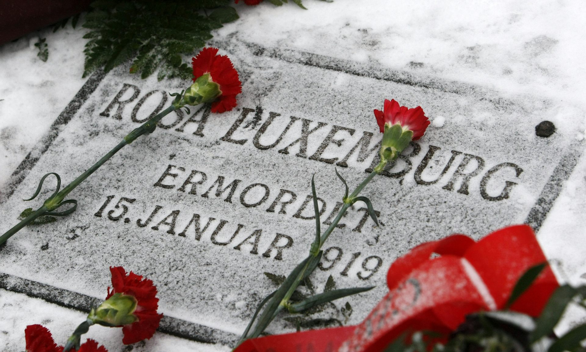 Red carnations are laid on the Berlin tomb of German communist leader Rosa Luxemburg during a ceremony to commemorate her death. Fabrizio Bensch/Reuters