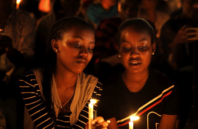Rwandan women take part in candlelit vigil in Kigali, Rwanda, in April 2019 to mark the 25th annivesary of the Rwandan genocide. (AP Photo/Ben Curtis)
