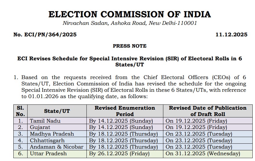 On December 11, the Election Commission revised enumeration and draft publication timelines across 6 states. In Tamil Nadu and Gujarat, enumeration was extended up to December 14, 2025, with draft electoral rolls subsequently published on December 19. Madhya Pradesh, Chhattisgarh and the Andaman & Nicobar Islands were granted a longer window, allowing enumeration to continue until December 18, followed by the release of draft rolls on December 23, 2025. Kerala’s revision followed the same trajectory, culminating in draft roll publication on December 23 after extended field verification.